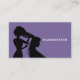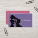 A hairdresser business card featuring silhouette of a hairdresser with scissors cutting hair over a purple background. The back comes with full contact information on a pink background.