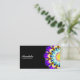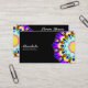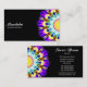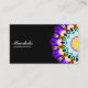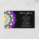 Um cartão de visita com um atraente motif de mandala caleidoscópico. Nome da empresa, etc., na frente, com outras indicações no verso, com uma variação no mesmo motivo.