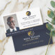 Design de cartão de visita de imobiliário moderno e profissional com espaço para fotografia incorporado ao design para mostrar o seu próprio retrato fotográfico. Design de layout mínimo e limpo com o marinho na moda e o logotipo da casa imobiliária dourada que você pode personalizar com seu nome comercial ou remover e substituir por seu próprio logotipo. O nome e o título são exibidos de forma destacada na parte inferior de uma faixa azul de marinho. Acentos sutis de ouro falsos são incorporados na design para adicionar um aspecto profissional elegante. Personalize com suas informações de contato. O verso apresenta o logotipo da empresa e informações de contato adicionais, como o endereço do site. Você pode alterar a cor do plano de fundo, a fonte, a cor da fonte e o layout para se adequar à sua preferência pessoal. O design de logotipo contido neste design é um trabalho artístico original por modologia.