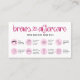 Certifique-se de que seus clientes saibam como cuidar de suas sobrancelhas laminadas com um cartão de visita de microbexiga personalizado. Este guia de pós-tratamento de sobrancelhas femininas inclui ícones de cuidado para cada passo e uma letra de script cardíaco de tendência em rosa. Este cartão de salão de beleza rosa e branca é a adição perfeita ao seu design de estoque de bar.