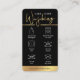 Certifique-se de que seus clientes saibam como cuidar do seu vestuário com uma cartão de visita personalizada de instruções de lavagem de roupas. Este cartão de serviço de lavagem de roupas pretas e douradas inclui scripts modernos e fontes serif, espaço para o seu logotipo e detalhes comerciais e ícones de lavagem (edite usando a ferramenta design para descobrir mais ícones nas camadas ocultas). Adicione este cartão de instruções de tratamento de roupas de luxo de ouro e termine a embalagem do seu butique de moda.