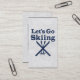 Vamos Vai Esquiar! Escos azuis marinhos e bastões de esqui com uma fonte amigável para dizer ei, o vamos encontra algum pó fresco e corta a neve em pedaços.