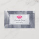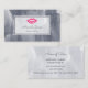 Um cartão de visita de cosmetologia de tendência para o artista maquiador que apresenta um par de lábios cor-de-rosa-chic contra um fundo de cinza de aço. Personalize adicionando o nome do cosmetólogo profissional, bem como informações importantes de contato.