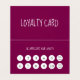 Aumente a marca do seu salão com o Cartão de visita de lealdade do nosso moderno Burgundy Red Hairdresser — a combinação perfeita de sofisticação e funcionalidade. Este design de cartão premium garante que seus clientes continuem voltando, ao mesmo tempo que adiciona um pouco de luxo à sua experiência. Uma cor ousada, mas elegante, que transmite sofisticação e luxo, ideal para salões sofisticados. Esquemas limpos com fontes contemporâneas e sotaques de na moda, perfeitos para a clientela discernível de hoje. Layout do programa de fidelidade: apresenta 10 slots bem organizados para selos ou punches, premiando clientes leais com serviço ou desconto após o preenchimento do cartão. Personalize com o logotipo, o slogan e as informações de contato do seu salão para torná-lo exclusivo seu. Ajustados perfeitamente integrados em carteiras, garantindo que sua marca permaneça no topo da mente.