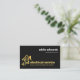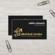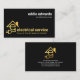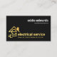 Um cobrir totalmente preto é acentuado por um design de "ficha de energia da casa" de ouro criativo, próximo à base da placa. ; A letra-E pode representar "eletricista" ou possivelmente o seu nome comercial. Ao lado do design é o nome da empresa e seus contatos. No canto superior direito está seu nome prestigiado e o cargo.