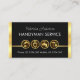 Um cobrir escuro é encapsulado por faixas de ouro em suas bordas esquerda e direita com uma linha de ouro perto da base. ; eis aqui uma série de ferramentas manuais douradas que podem representar alguns dos serviços que você oferece, por exemplo, a fita de medição de furos pode representar a reconstrução doméstica, etc. Logo abaixo, esses logotipos são os detalhes de contato. Seu nome prestigiado e o nome comercial "HANDYMAN SERVICE" que você pode mudar estão no topo. No verso, o logotipo de serra que você pode usar é no topo. Isso é seguido pelo nome da empresa, seus detalhes de contato e uma legenda de slogan que você pode alterar. Um design de excelente para o trabalhador, empreiteiros de construção para usar.