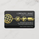 Uma camada de cinzas apresenta uma linha global de ouro criativa ligada aos vários tipos de logística, ou seja, o navio de ouro que representa o transporte marítimo, o avião de carga aérea, o caminhão para terra e a camada de ligação de circuitos informáticos logo abaixo. O movimento à frente do caminhão de ouro indica sua liderança na arena global, seu padrão internacional. Seu nome prestigioso e o título do cargo estão no topo com os detalhes de contato e uma opção de legenda de slogan que você pode mudar, na base. No verso, em uma cobrir escura, no topo está um logotipo do globo dourado que você pode usar. A isso se segue o nome da sua empresa, os detalhes de contato e um slogan para anunciar seus serviços. Um cartão de excelente para as empresas de logística, transporte e cadeia de abastecimento. #logística #fornecedorcadeia #carga #transporte #transporte #entrega #entrega #transporte #entrega #frete #transporte #globalização #transporte caminhoneiro #global #zazzlemade