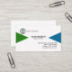 Características de design um cartão branco com dois triângulos em extremos opostos. À esquerda é um triângulo verde, enquanto à direita é azul. Acima do triângulo verde são seus logotipo e nome da empresa. Descansar entre os triângulos senta seus nome e posição. Os detalhes do contato estão no canto mais baixo do righthand. Simples, liso, preciso e puro. Este cartão seria serido para vendas, marketing, distribuição e logística.