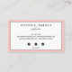 Faça uma impressão excelente com estas cartões de visitas bonitas e femininas. O design mínimo apresenta um retângulo cor-de-rosa com uma borda geométrica preta com o seu nome ou nome comercial no centro, em letras negras modernas. Personalize o reverso com as informações de contato do seu cheio em preto sobre fundo branco com borda rosa e preta correspondente. Inclui três ícones de mídia social e espaço para seu nome de usuário. Este design faz parte de uma coleção, visite nossa loja para outros itens correspondentes. Outras cores disponíveis. Qualquer cor disponível mediante solicitação, escreva para citronelladesign@gmail.com