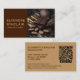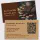 Elegant business card for chocolatiers with half cacao photo layout and social media icons. Brown and caramel split design with QR code, Facebook, Instagram, WhatsApp, Pinterest. Customize name, business details, contact info, social handles. Bold visual impact for luxury chocolate brands.
