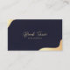 Minimalist business card design featuring a deep navy background with elegant metallic gold corner accents.