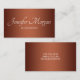 A imagem apresenta uma chave ou gradiente de cobre escovado. É um gráfico digital, não um design metálico real. Nome ou negócio numa fonte de caligrafia moderna glamourosa, embora você possa mudar esse estilo. O título do trabalho e as informações do contrato criados usando Bonés Bloquear ... todos os bonés. Há um espaçamento de caracteres aplicado que é personalizável. Para empresários on-line, personalize e adicione mais ou menos do que número de telefone e mídia social e/ou site. Para os profissionais, há espaço para um endereço físico e outras informações.