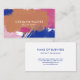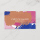 Cartão de visita elegante e estiloso num desenho de tipografia minimalista com fontes brancas modernas contra salpicos e pinceladas de aquarela em azul-marinho, fúcsia e terracota.