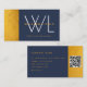 Um design de monograma moderno com cor azul marinho de fundo e sotaques dourados. Um cartão de visita de código QR inicial minimalista personalizado para homens e mulheres que têm um brilho pelo estilo. Uma maneira simples e profissional de apresentar sua empresa. Personalize seus detalhes para criar seu próprio cartão de visita exclusivo.