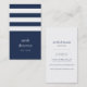 Design de cartão de visita moderno e chic em um formato vertical exclusivo apresenta três grandes faixas brancas em um fundo azul de marinho clássico, com seu nome e nome comercial ou título em uma mistura atraente de serifas minúsculas e tipos de bonés modernos. Adicione as informações de contato do cheio à parte traseira no marinho correspondente. Adequado para qualquer ocupação; exemplo mostrado para empresas de boutique.