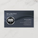 Este simples cartão de visita de mecânica automática elegante e profissional apresenta um fundo preto. Uma onda preta abanada segue da esquerda para a direita, dividindo a placa em duas seções. Um ícone circular do conector hidráulico de carro cromo fica nessa onda, no lado esquerdo da placa, enquanto seu nome e título aparecem no canto superior esquerdo e seu nome comercial e detalhes de contato aparecem no canto inferior direito. Concebidos para empresas ou profissões relacionadas com transportes, transportes, automóveis, caminhões, caminhões, transportes terrestres, transportes marítimos, logística, transportes, automóveis, reparação automóvel, mecânica automóvel, garagem, temas de motores.