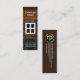 Uma parede da casa do tijolo com uma janela branca senta-se no centro do cartão. Seus nome e posição prestigiosos descansam na parte superior em uma coluna marrom. Para o sul para a base é um trabalho de tijolo do verde esmeralda que abrigue seus detalhes do contato.