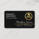 An all-black cover is accentuated by a faux gold line near the base of the card. This area has a gold chauffeur's logo you can use followed by the business name "Chauffeur Service" which you can change and your phone contact. Your prestigious name and job title are at the top left corner.