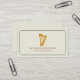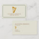 A minimalist business card featuring a stylized golden harp silhouette against a soft cream background. A thin border of dark green frames the card. Perfect for harpists, musicians, teachers, instructors, and concerts.