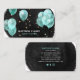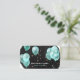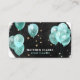 A unique professional business card, which is perfect for event and party planners. This design features a black watercolor background decorated with faux gold stars and elegant turquoise balloons. The reverse of the card has your contact details and social media icons (which are removable by clicking "customize further").