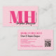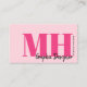 Cartão de visita de Monograma Simples e Rosa Quente. Você pode mudá-lo para qualquer empresa que quiser — maquiador, especialista em lash, cabeleireiro ou até mesmo algo como marketing, consultoria e muito mais! Apresentando uma mistura de fontes rosa-quente e preto em tipografia clássica e em negrito emparelhada com uma fonte de script elegante para os detalhes. A parte traseira inclui espaço para um código QR para que os clientes possam se conectar rapidamente ao seu site, com ícones de mídia social exibidos acima dele — você pode remover os ícones que não quiser mantê-lo limpo e personalizado. Uma tendência e um aspecto chique que ainda é profissional e elegante. Você pode mudar todas as cores para torná-las como quiser. O nome lateral na frente deve funcionar com a maioria das iniciais, mas, se não, você pode querer brincar com o espaçamento no editor de cheios.