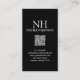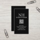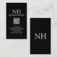 Cartões de visitas modernos de código QR apresentando um design preto simples e mínimo com seu monograma em uma fonte em negrito junto com seu nome no topo. Abaixo estão suas informações de contato.