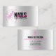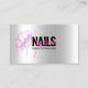 modelos de cartão de negócios personalizados de arte em unhas acrílicas. base de folha fina prateada de platina com contornos de mão metálicos falsos de fink quente. a frente apresenta um preenchimento de unhas opais iridescentes de arco-íris e a parte de trás apresenta um preenchimento brilhante rosa quente.