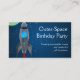 Comemore o aniversário ou a ocasião especial do menino com este navio legal do foguete de espaço no espaço. Céu azul escuro com estrelas e os planetas coloridos, e um tiro de prata do foguete através do céu. Colorido e brilhante. Todo o © de Copyright do design www.CustomInvitesOnline.com 2012