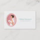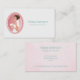 Cartão de visita profissional com uma ilustração de uma noiva sorridente segurando um buquê de flores em seu vestido branco de rico e vestindo um véu. Defina dentro um quadro oval cor-de-rosa com uma borda dimensionada.