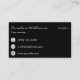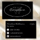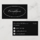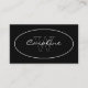 Um cartão de visita em um simples e elegante design branco a preto com um nome e monograma em um oval na frente e informações de contato na parte traseira.