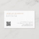 Um cartão de visita inteligente com nome e ocupação sobre fundo brando com cinzas e texto branco. A parte traseira tem um fundo branco com texto em tons e preto com código QR e informações de contato. Funciona bem para muitas profissões.