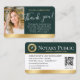 Agradeça aos clientes com esse obrigado personalizado que você cartão de visita. Uma maneira perfeita de mostrar sua apreciação e convidar colaborações futuras. Este design de na moda mostra sua foto, junto com uma elegante letra de script. O verso exibe uma caneta de pena em um selo - ou simplesmente substitua pelo seu logotipo. Um código QR é incluído na parte traseira, encorajando os clientes a fazer links para um site de revisão e deixar comentários. Ideal para um notário público, agente de assinatura de empréstimo, agente de entrega de confiança notarial certificado, CNTDA, notário móvel, serviço de assistência telefônica ou outra profissão jurídica. Cores impressas: verde escuro Floresta Negra, com elementos dourados. Compre a coleção on-line para obter ideias e suprimentos de produtos mais populares, projetados para notários!