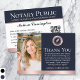 Agradeça aos clientes com esse obrigado personalizado que você cartão de visita. Uma maneira perfeita de mostrar sua apreciação e convidar colaborações futuras. Esta modelo de design mostra a sua foto, juntamente com uma caneta de penas em um selo - ou simplesmente substitua pelo seu logotipo. Um código QR é incluído na parte traseira, encorajando os clientes a fazer links para um site de revisão e deixar comentários. Ideal para um notário público, agente de assinatura de empréstimo, agente de entrega de confiança notarial certificado, CNTDA, notário móvel, serviço de assistência telefônica ou outra profissão jurídica. Cores impressas: azul escuro da meia-noite (azul-preto) e branco, com elementos cor-de-rosa e rosa. Compre a coleção on-line para obter ideias e suprimentos de produtos mais populares, projetados para notários!