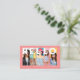 Design de cartão de visita moderno e moderno, com um layout de cinco fotos. "Alô" é tipografia projetada e colocada sobre cada foto. O fundo é colorido em rosa. O verso apresenta as informações de contato projetadas em um layout limpo e mínimo.