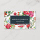 Um cartão de visita elegante com padrão de rosa floral vermelha e rosa em torno do seu nome em um retângulo preto