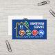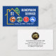 Um cobrir azul apresenta uma estrutura criativa de construção que abriga um design de ícones de ferramentas de mão de obra. As ferramentas podem representar alguns dos serviços que você pode oferecer, por exemplo, a fita-medida marrom pode representar reparos em casa, pincéis verdes para remodelação de pinturas, etc. Na parte superior do cartão está o nome comercial "HANDYMAN SERVICE", com os detalhes de contato perto da base. No verso, em um cobrir branco, no topo está um logotipo da paisagem dourada que você pode usar, seguido do seu nome prestigioso, detalhes de contato e uma legenda de slogan para divulgar seus serviços. Um cartão profissional para que o trabalhador e os empreiteiros usem. #handyman #construcder #contratante #remodelador #empreiteiro #construtor #homerepair #telhado #handymantools #homerepaircontratante #zazzlemade