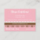 Um cartão de visita com um charmoso e caprichoso original do Mango Moon Studio design, criado especialmente para padarias, compras de cupcakes e lojas de doces. A paleta colorida de rosa macio e castanho rico cria uma estética deliciosamente doce, evocando instantaneamente as elegantes guloseimas encontradas em sua padaria ou compro doce. As riscas e bolinhas encantadoras acrescentam um senso de diversão e brincadeira. Adicione seu slogan e informações de contato no verso.