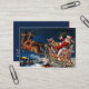 Um cartão de visita bonito do natal vintage que caracteriza Papai Noel que monta seu cheio do trenó dos brinquedos acima de uma cidade do inverno.