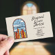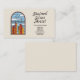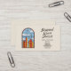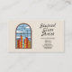 Cartões de visitas com uma ilustração desenhada à mão de uma janela de vidro manchado com um céu azul, nuvens brancas e edifícios vermelhos e amarelos: perfeito para artista de vidro manchado, mas também design de interiores, florista, designer artístico, planejador de casamento, etc