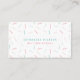 Esta cartão de visita de mamãe bonita e moderna apresenta seu nome e sua informação em azul-turquesa e rosa com borrifações em rosa-pastel, verde e amarelo em fundo branco. O verso apresenta um fundo branco simples. Altere a cor de fundo e personalize-a para as suas necessidades. Você pode encontrar produtos correspondentes na minha loja.
