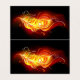 Pena de pavão brilhante feita de fogo e chamas sobre fundo negro.