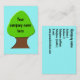 Este cartão de visita totalmente personalizável apresenta uma imagem digital divertida de uma árvore com um topo verde e um tronco marrom sobre um fundo azul-céu. Você pode digitar o nome de sua empresa na árvore na frente e digitar todos os outros detalhes importantes na parte traseira da placa. Clique no botão "personalizá-lo" para ajustar o tamanho, a fonte e o local do texto para atender às suas necessidades exatas. Esta cartão de visita foi projetada para arboristas e jardineiros, mas é adequada para outros tipos de negócios também.
