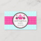 © 2021 Socialite Design Inc. Cupcake e pop de bolo cartão de visita com uma fita poka-ponto rosa brilhante e um padrão de turquesa vibrante. Um cupaque cor-de-rosa e dois pop de bolo são dentro um banner de texto com cadarço/redimensionado onde você pode adicionar suas informações comerciais de padaria. A parte traseira adiciona uma área para mais informações sobre sua empresa.