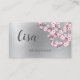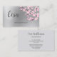 Esta cartão de visita profissional apresenta ramos cor-de-rosa de cereja florescentes em um fundo falso de folha prateada e uma grande caligrafia manuscrita para o seu nome. Cartão de visita floral de luxo para maquiadores, spa, paisagismo, planejadores de casamento, cosmetólogos, salão de beleza...
