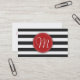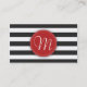 Estes chique & cartão de visita elegante caracterizam um fundo listrado horizontal preto e branco clássico. Sobre o fundo é um círculo decorativo vermelho brilhante com um monograma branco customizável. A parte traseira do cartão é branco simples com sala para seus detalhes do nome, da posição & do contato. Este é os cartões de visitas ideais para indivíduos dos trabalhos em rede, salões de beleza & termas, boutiques, maquilhadores e profissionais da indústria da moda.