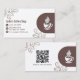 The trendy front design features a modern image of a white coffee cup or mug, surrounded by simple line art images of coffee beans. To the left is a personalized option to add your company name and add contact information (telephone number,mailing address, website) in modern brown text and icons. Flip over to the back and change the QR Code URL (add url to ordering menu or send customer to a specific website), below it add scanning instructions, such as scan to view our menu. Browse our matching products, such as loyalty cards.