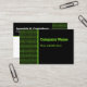 Um design preto e verde limão profissional que tem um tema cibernético com o detalhe do código da máquina. A frente tem suas informações de negócios em uma combinação verde/preto de alto contraste que se assemelha ao texto do computador em um console ou terminal. O inverso é um clássico preto-e-branco com um quadrado de linguagem binária para adicionar interesse e tem espaço para suas informações de contato importantes.