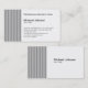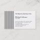 Umas riscas do clássico ancoram o lado deste design com as listras dobro pretas em um fundo cinzento. Profissional para serir algum negócio. Seus nome da empresa e informação são lado esquerdo limitado para coincidir com o design listrado e apresentado em um fundo branco para a leitura fácil. Apenas incorpore sua informação personalizada como necessário. Uma linha extra é fornecida para mais informação ou slogan. Apenas suprima que a linha se não se usou. A parte dianteira repete a beira lateral pinstriped e seus nome e título - mantenha, mude ou supressão para sair claramente - lá são igualmente sala nesse lado para todas as notas escritas ao apresentar a seu cliente.