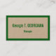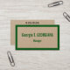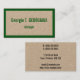 Este simples, humilde e simples design de cartão de visita apresenta um nome, profissão e informações de contato que podem ser personalizadas. Ele também apresenta uma borda verde colorida na frente. Cartões de visitas como estes podem ser utilizados por um profissional, como um freelancer, um engenheiro ou um médico.