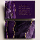 This real estate business card features a purple watercolor agate border trimmed with gold faux glitter on the left and gold-colored text on the right on a purple background. A matching purple and gold agate design appears on the reverse side.